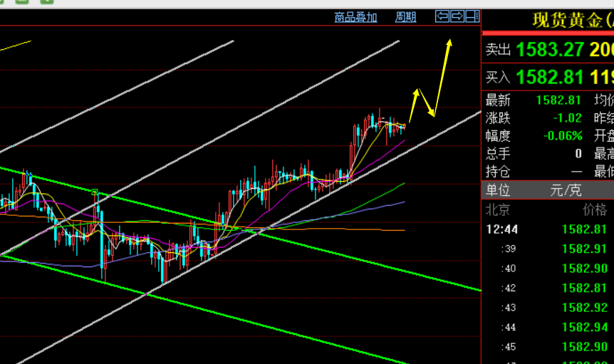 具体短期中期和长期方向昨晚周评当中已经很详细点评,对于今日来讲,只简单提及一两点重复即可:第一,周线有望依托5均线继续偏强拉升,上方1592-1594一旦突破站上,下一个基本会冲击1611 前高点; 第二,小时线早间下探1580后反抽,意味着1580符合短期支撑继续看涨,上方关注1585,突破才能延续上行,而通道的下轨支撑是1579一线,作为一定防守即可