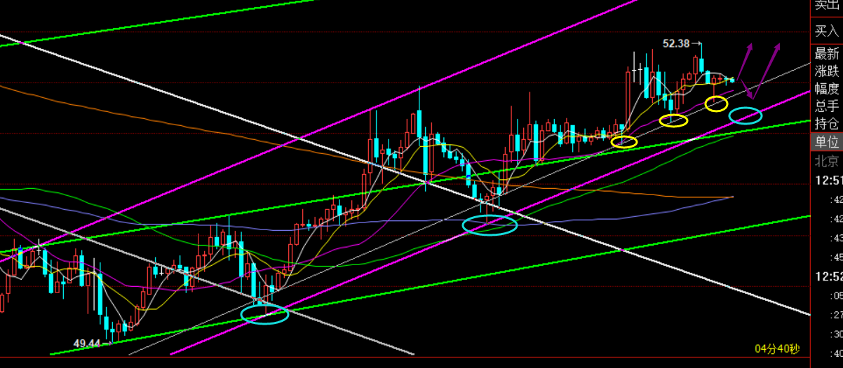 周评中强调短期面临反弹修正开始,52.2-52.3一旦突破站稳,会直接冲击53,后市关键多空拐点是55-55.5压力;今日早盘先高开拉升至52.4一线冲高回落,下方依托51.8趋势支撑小幅反弹,此位置也是短线预期的做多点,按目前通道也是上行,上周五半夜起涨点51.6,以此作为一定防守,震荡继续看上行反弹修正即可,重点关注欧盘强弱,若还是无法站稳52.2-52.3则有可能还会周线级别压制一次,届时再考虑布局一次波段多单,以49作为节点,逢低布局,看55-55.5;