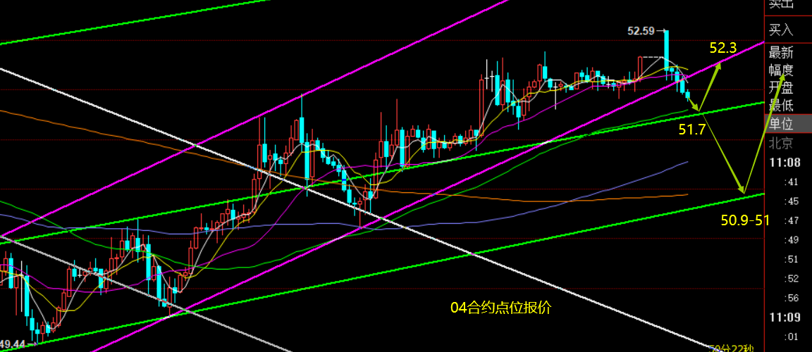 昨日思路是预期看52.2-52.3关键压力的上破,扩大反弹修正力度,昨晚收盘前形态是可以的,处于52.2-52.3高位,日线阳K线后紧跟长下影小K线,有续涨作用,但今日早间开盘跳空低开,力度偏大,就打破了原本预期,因为价格冲高走跌,破位了如图紫色趋势通道下轨,要测试绿色下轨通道位置51.7一线( 今日开始以04新合约点位报价), 此位置也是上周五半夜起涨点,若这里破位守住,短线或冲重新回到50.9-51下一个绿色关键通道支撑,这里也是可以计划小波段做多的位置,因为周线大阳反包,49上方支撑应该存在,本周下探回补企稳后再上拉也是比较大的概率;因此操作上,可反弹52.2及上方先空,下看51.7,继续破位指向51-50.9后再反手去布局多单;