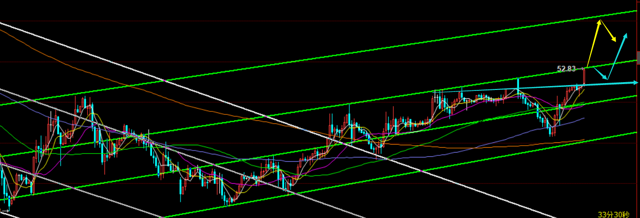 昨日亚欧盘一路弱势下跌,美盘借助利多消息迎来洗盘上涨,比较惋惜的就是价格差一点未给到50.9趋势通道下轨做多点,日线探底拉升,意味着51.4处支撑较强,而目前早盘直接破前高,冲击52.8通道压力, 能否延续上涨关注此位置得失,操作上今日回测多为主,早盘52.1起涨点作为一定防守,预计依托52.2-52.3前期压制点作为顶底转换支撑去进一步的反弹上行,站上52.8,可以指向上一个通道压力54.3,也是前期开跌口;周线底部大阳包阴后,昨晚下探51.1,算是进行了一定回补修正,再往上拉就很容易延续;因此今日操作上可以52.1-52作为支撑点,逢低去做多,站稳52.8-52.9 则进一步的拉升试探53.3和54.3;(04新合约报价)