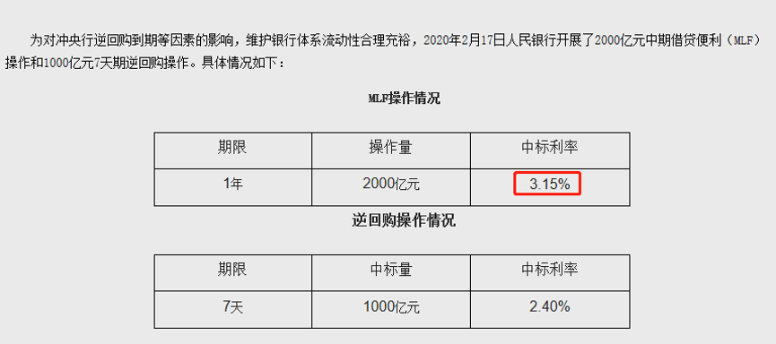 人民银行公开市场操作的工具较多,根据各个工具期限和金额的不同,存在多种利率水平。其中较为著名的是逆回购操作利率和MLF操作利率,前者周期较短,多为1周或两周的利率指引,后者期限较长,对中期利率市场引导作用明显,受关注度也更多。昨日,人民银行发布公告称,为维护银行体系流动性合理充裕,开展2000亿中期借贷便利(MLF)操作,中标利率为3.15% 。该中标利率相比上次进行的MLF操作利率(1月15日,操作量3000亿)3.25%来说,下降了10个基点。