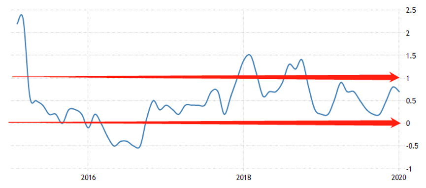 最近五年来,日本的CPI大部分时间处于0%~1%区间之内,中指0.5%,远低于健康通胀水平。安倍经济学的缔造者——安倍晋三——曾经说过:日本央行的目标是摆脱通缩。摆脱通缩的主要方法,安倍看来,就是施行超级量化宽松(QQE)政策,开动印钞机,不断向市场提供低息贷款。通过QQE政策,逼迫日元贬值,进而提高日本商品的出口竞争力,进而助推日本经济的增长。这也就是安倍经济学的三板斧:一、无限量印刷并投放钞票;二,大规模政府举债支出;三,促使日元持续贬值,获得商品出口竞争力。