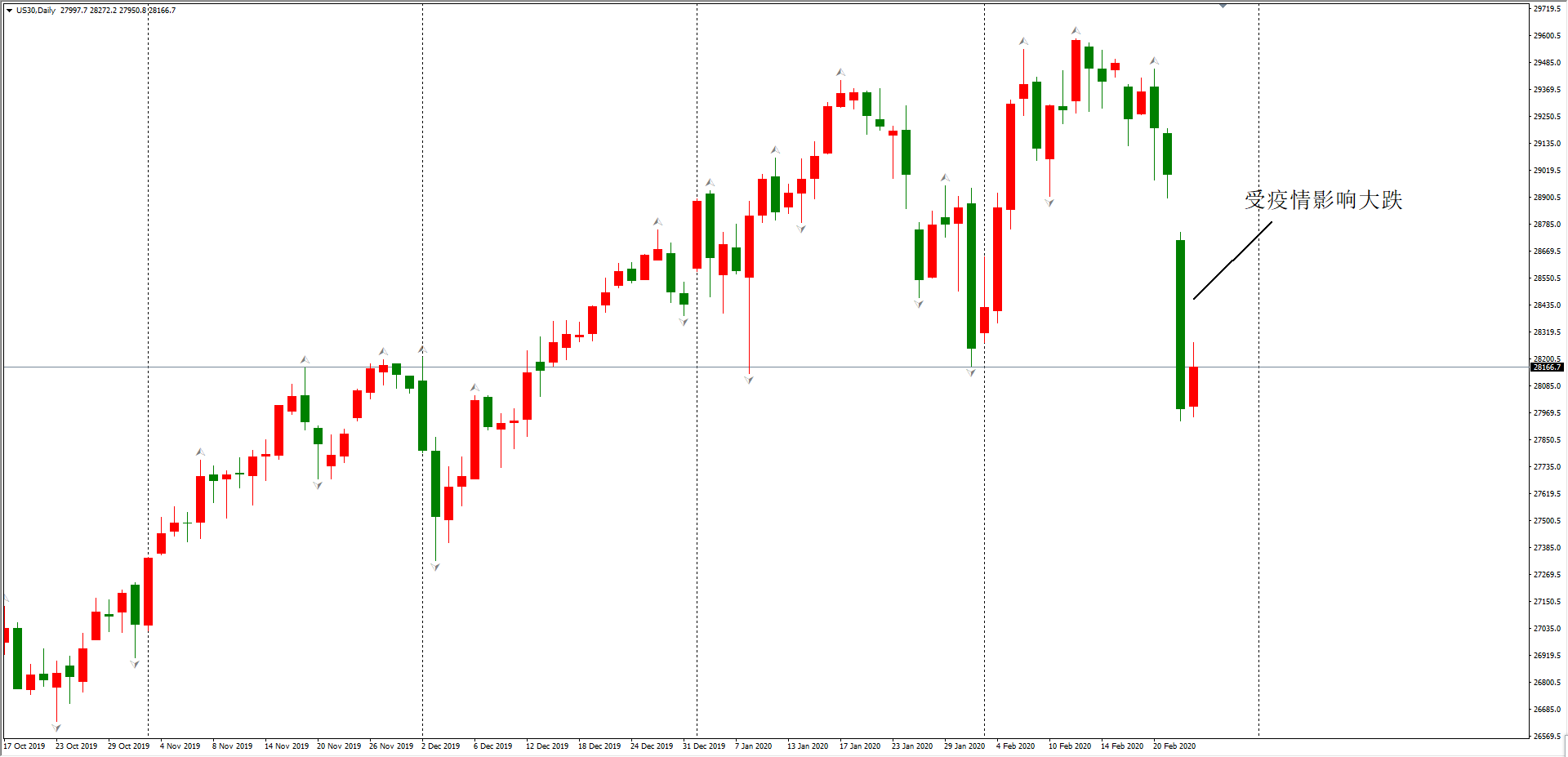 本轮下跌,市场解读为新型冠状病毒肺炎在全球范围内新增确诊病例的迅猛增长,导致投资者对未来全球经济增速持有悲观预期,进而导致美股资金部分撤出,从而引发巨幅下挫行情。世卫组织(WHO)在日内瓦召开发布会,总干事谭德塞表示:“目前在中国境外的28个国家中出现了2074例病例,其中有23例死亡病例。就在最近几天之中,新冠病毒疫情在日本、韩国、意大利、伊朗等国家呈现激增态势,令人担忧。”WHO的这一表态加剧了美股的下跌。