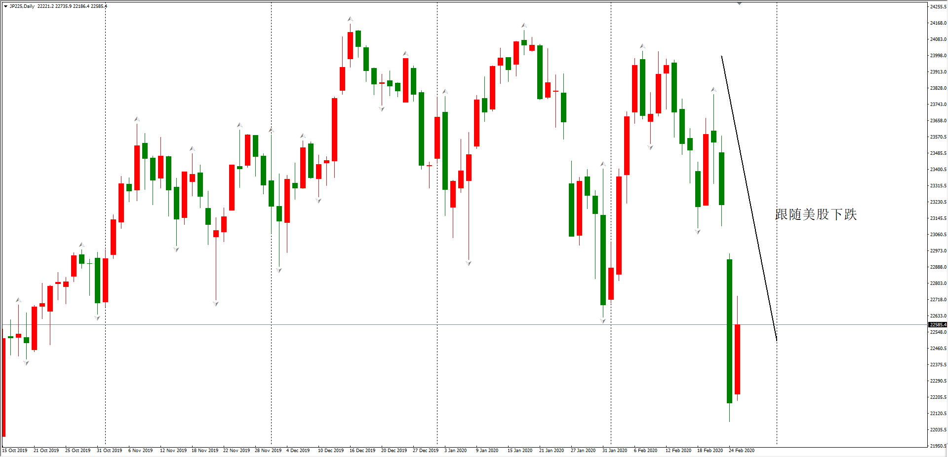 日经225走势与美股存在较高共振型,预计走势V型反转的概率也较大,但需要等待全球新冠肺炎确诊病例数量拐点的到来。根据最新消息,日本新型冠状病毒感染肺炎确诊总数上升至850例,其中东京都确诊总数达到32例。从改开消息来看,日本的疫情控制举措并没有中国那么严厉,诸如封村封路、延迟复工和禁止聚集的措施均为出现。日本政府只是“要求推进让有发热症状的职员休假、错峰通勤、远程办公等措施。”以笔者来看,这种方法并不能有效降低信管肺炎的传播,所以日本的疫情拐点远未到来,日经225指数还将出现进一步下挫。