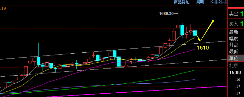 本周黄金走势很嗨,并不是单边嗨,而是每天大幅度的来回洗盘,基本一天50美金以上是少的,短线变化的速度也极快,在全球股市持续单边下跌背景下,黄金也多次遭受砸盘瞬跌,让很多人迷失了方向,今日具体分析如下:第一,周线和月线保持不错的单边上涨模式,均线多头排列,本周黄金来回的洗盘属于调整阶段,并未改变趋势,极限的位置是回测确认周线5均线1610,同时也是顶底转换点,依托这里会再次崛起多头上涨;第二,日线方面,作为短期偏强多头上行,10均线的防守是关键点,大致在1625-1620区域, 此位置支撑有效,趋势不轻易改变,同时前期上行通道被强势上冲破位后,回测确认的点,也是极限调整位置,在1610一线,与周线支撑同步,因此1625和1610是两个关键节点,也极有可能是波段买点;第三,小时线图,前期通道的衍生回测点刚好在1625,于本周双底支撑有望形成三底,操作上今日可依托1625逢低企稳多,若守不住则,1610逢低再多一次,这两个位置都要值得去参与;第四,前期一轮单边从1560开始,最高1690,按分割原则,1625刚好处于50%回测位置,偏强的调整基本到此也容易结束,极限的调整是618支撑1610,此位置又同步于第一、第二点;因此,操作上,今日关注1625三底支撑逢低先多,阻力1649-1650早间开跌口,突破则试探1660-63最后压制口; 另外,若1625再次遇砸盘破位,则1610逢低波段多;