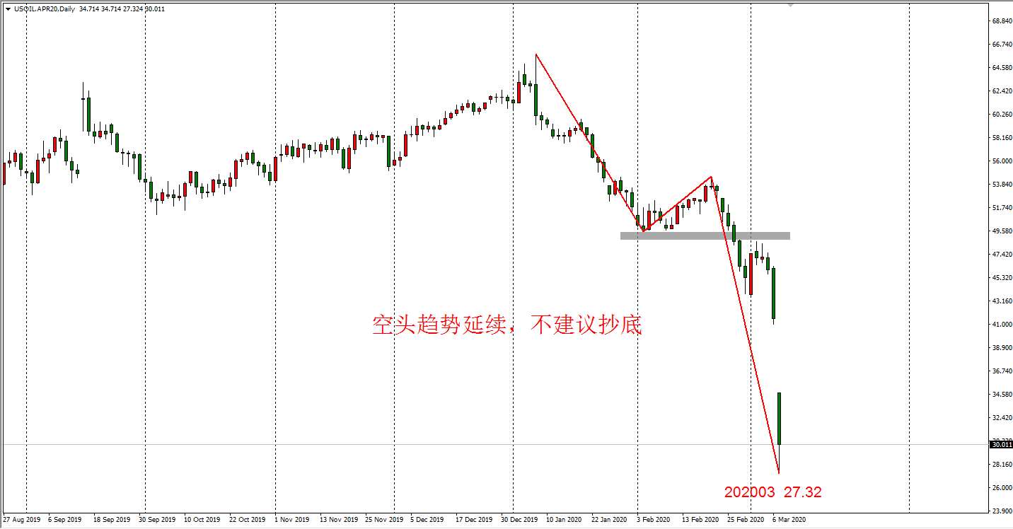 自2016年2月份原油创出新低26.12美元/桶开始,油价一路上冲,直至2018年9月份达到最高点76.96美元/桶,随后一路下行,直至2020年3月份,也就是今天,创出新低27.32美元/桶。2016年油价与2020年油价相差仅仅1美元,原油可谓是走出了一个完整循环,为期50个月。其中上涨周期30个月(占比60%),下跌20个月(占比40%)。上涨周期中,价格自最低点至最高点,翻了整整三倍;下跌周期中,价格自最高点至最低点,跌幅最大至64.50% 。