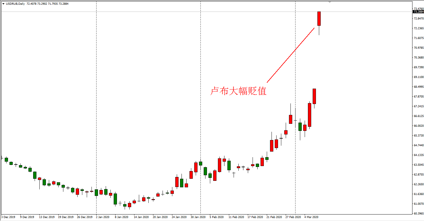 俄罗斯卢布也算是商品货币,对标原油和天然气。现如今油价和天然气价格双双跳水,卢布出现大幅贬值也就不足为奇。当前USDRUB汇率为72.94,上周五收盘68.35,贬值幅度高达6.71%,这一百分比在汇率市场显得尤为巨大。