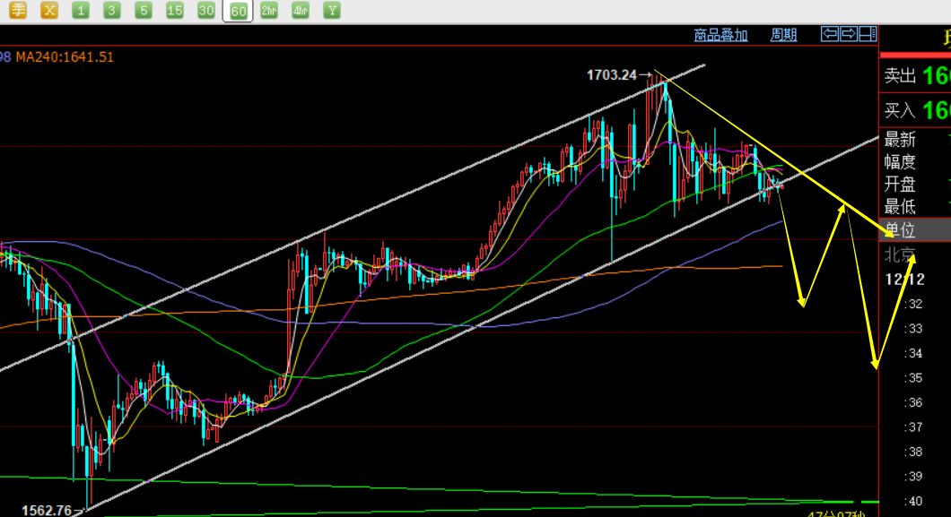 昨日早间高开冲击1700上方,但多次刺破回落,无法站上,午后迎来一波大幅下挫, 整个欧美盘就一直围绕1680-1660这20美金来回整理,晚间笔者实盘会员中布局了一次短波段空,1682-83空,最低下滑1661,足足有20美金盈利空间,也算弥补了白天的不足;那么对于今日来讲,仍旧看好一波跳水下滑,分析几个技术点:第一,尽管近期美股持续走弱,昨日还发生历史以来首次熔断机制,各大央行纷纷降息,对于黄金是存在不断的避险需求,不过也由于原油昨日跌幅过大,大宗商品集体抛售,也带动了黄金一定的跟随,因为黄金近期来讲,具备两面性,一则是避险刺激拉升,二则是受其他商品指数抛售而带来的跟随性抛盘,从而导致黄金属于大区间的来回洗盘震荡局面;第二,昨日分析,周线级别,极有可能以大阴大阳的循环切换来演绎,并依托10均线逐步震荡上行,因此本周一旦再次杀跌,最大极限可以指向1600一线,继而下周再依托此位置反击上涨;第三,日线级别,关注的是1666通道支撑,一旦收盘于下方,意味着短期回落将启动,后面几天震荡下滑1600概率就逐步加大;第四,小时线级别,如图,上行通道已经濒临下破,支撑1660-1657,这里破位,跳水就来了,下方可以逐步指向1650、1633、1616,以及1596强支撑,而阻力1671、1681、风水岭1685都是压制点;总结:以1685-1681作为强压风水岭,其下小波段看空至1650-1643、1633;首次触及1633和1616都可以分批去低多,因为走势上即便跳水,也很难持续走弱,而以区间来回震荡氏对待,急跌之后往往容易遇到前期关键支撑而瞬间反抽一波,对于大波动而言,一个反抽10美金以上很容易;