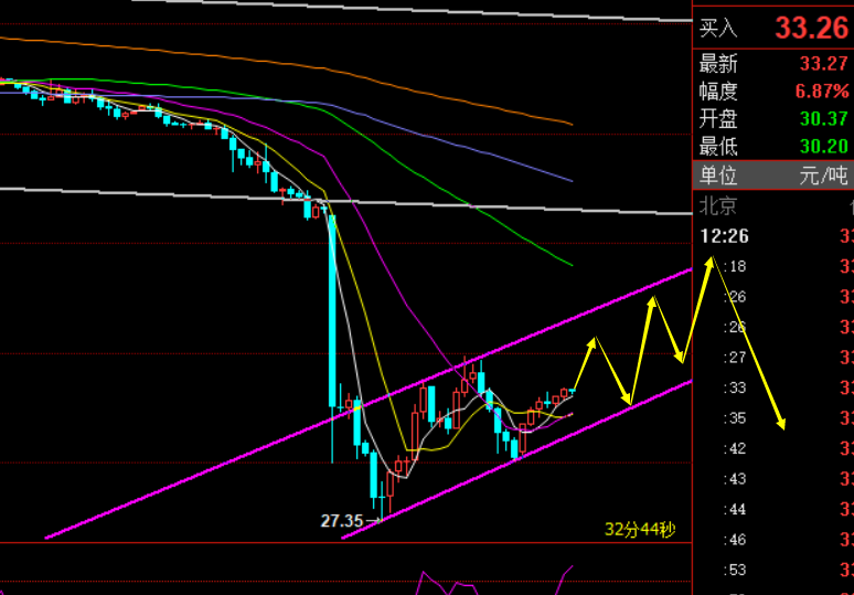 昨日原油先大幅30%低开,触及30关口后,反弹压制33.6再次弱势下跌,最低给到27.3一线后,欧盘迎来V型的反抽,晚间思路提出,一般大V走势,都存在一定回测延续上涨,因此给出30-30.3逢低去跟多,结果丝毫不差,半夜触及后今日早间直接拉升至33,遗憾的一点就是入场点的到位时间太晚,只有挂单交易才能进去;那么今日该如何解读:第一,大趋势空头仍旧是维持不变,由于周一低开太多,存在反弹震荡修正回补缺口也是比较大的概率,那么从日线级别回抽确认的压力点集中39一线;第二,4小时级别有一个34.8一线压力,也是隔夜高点,处于短期10日压制,只有这里突破站上了,才能进一步的反弹修正至37、38、39;第三,小时线按照目前预判上行通道以及分割支撑重合,可以看出,短期压力在33.2、33.7,关键压力34.8,支撑31.8,想要延续反弹必须守住31关口,而30可以作为强弱的风水岭,再度破位,就要再一次试探27-26底部位置;总结:目前原油倾向于一定反弹修正,以回测跟多先来看待,31.8支撑上逢低小波段多,看34.8,突破则进一步指向37-38,触及39下压制反手计划波段的一次空单,后市还会有二次的底部试探动作出现;