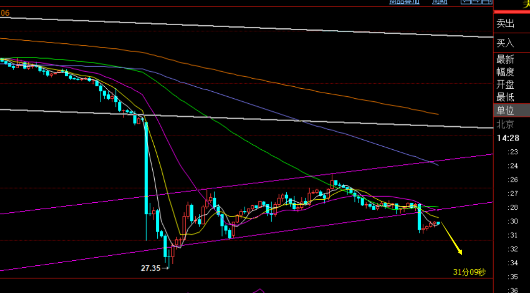 本周初一路震荡上行反弹修正,昨日早间大涨,触及36.3一线后迎来倒V破底洗盘行为,且破位了上行通道支撑,这意味着反弹修正结束,回归弱势空头的再次打压,毕竟趋势空头一直未变,周一跳空的缺口并未回补到位,昨夜EIA利空,但价格一直横盘于33.5一线,今日直接大阴跳水,这就明确走弱的特性,接下来的操作反弹跟空就行,按照33.6跌至30.6分割压制看,弱势走势是不太可能突破618位置,因此只要以32.4作为防守,反弹都可以去择机做空,下方看30-29.5支撑,不仅是4小时下轨位置,也是周一大幅跳空的第一支撑,再破位则指向27-26底部二次试探;另外,小时线级别大阴后,目前处于小幅横盘反弹,弱势走势,要 干就只能直接空,不能等反弹,一旦反弹过大,就容易走震荡了;