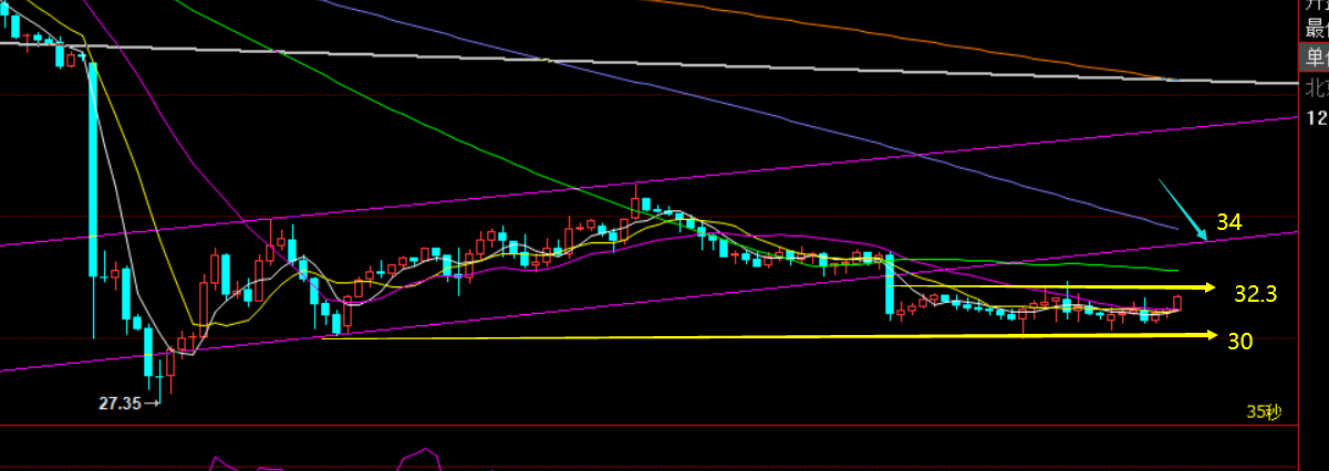 本周初震荡上行修正,周尾压制走弱,不过整体应该还处于底部的整理过程,昨日下滑至30后快速拉升,刚好和前期低点形成一定双底,不宜追空,凌晨压力32.3,也是日线5均线压制,午后关注此位置压力得失,预计可以突破的,一旦站上,可以择机回测多看34一线,也是如图反弹确认通道下破口的位置,作为原油技术思路将的不多,因为走势已经慢慢有所平稳,不像黄金大幅运行再次打开,重点往黄金方面布局,原油短线上关注即可,不过他急速的短线运行也较快,严格带损;