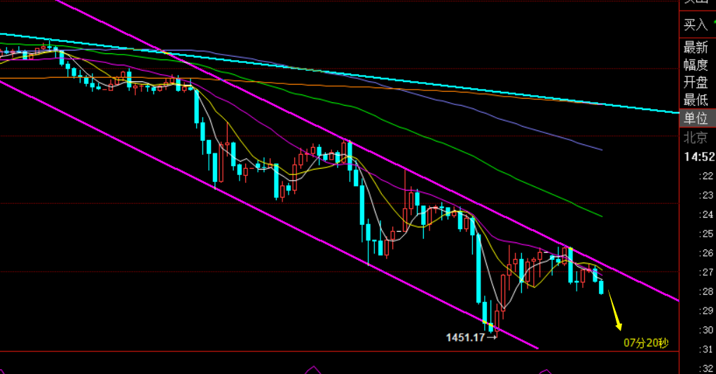 昨日黄金一天运行幅度少说200美金是有的,从1575高点,跌至1451低点,又反抽到了1520,而途中随便一个小震荡,都有20美金,如此大的规模,轰动了整个投资市场,而昨日笔者共喊了四次波段空,1558-1560空、1545-47空、1540空 以及1504空,最低下探1450,随便持有一波拿到底都是100美金,当然没那么大的毅力,一般一个波段把握20-40美金足以了,累计几次也达到百金盈利;对于今日如何分析:第一,月线下破10均线1500,周线下破上行通道支撑,日线还是连阴发展中,这依旧处于偏弱的下跌当中,继续反弹空即可;第二,4小时级别一直压制10日不断下挫,每次触及此均线都是一次不错的波段做空点;第三,小时线昨晚依托下跌通道下轨1450-60附近探底拉升,半夜一直压制1520无法上破,早间起来一看,还是这个价格压制,果断给出1514-15波段空,抵达1485顺利拿下30美金,午后小幅反弹,5分钟高位1502-03运行了一定时间,突然一根大阴下滑,再次急速给出1500跟空,很快1489短线盈利收割,动作要干脆,不要丝毫犹豫,干了再说,起码方向是顺势的就行;最后,由于1484-85破位,欧盘反弹依然干空下行,有希望触及小时线缩口下轨支撑1460一线,建议1500下能反弹机会继续空下去,当前还是不考虑做多,除非1450二次支撑反抽再考虑布局;