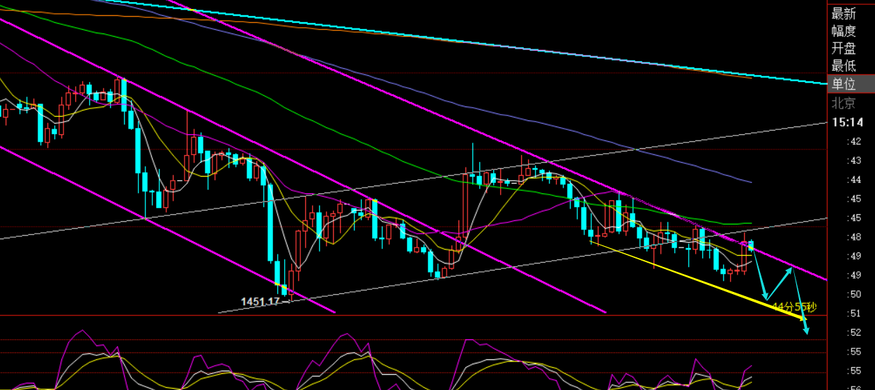 昨日亚欧盘同样弱势下跌,美盘围绕1520-1500区间来回折腾洗盘了多次后,半夜稳定受压下挫,最低触及1473一线,面对这样的走法,建议顺势大趋势做空为主,反弹压制去不断测试空,千万不要想着多空来回都想赚,否则给你多次来回打脸;今日解读如下:第一,日线连阴后,昨日首次出阳,我们知道,单阳改变不了弱势局面,今日早间一波下的至1464低点,就证明了这一点;第二,下方1460-1450支撑应该依旧存在,亚盘弱势下滑,午后反抽无力,但欧盘并未延续下跌,而是出现一根阳线上拉,力度也不小,冲击1496,这说明后面的走势决定于1460-1450支撑,以及1500早间阻力之间的争夺选择;第三,这几天白银都作为先锋部队,它每次横盘后直接大阴,而黄金若不动,则是下空的时机;第四,关注美股走势,一旦发现走弱破底迹象,也是做空黄金的时机;第五,日内做空位置一般还是参照隔夜下跌的618反抽阻力,或者日内下跌的618压力,有时会刺破也正常;目前风水岭1501早间高点明确,以此作为防守,反弹还是空为主,短期压力1493下压制,下方支撑看1460-50得失