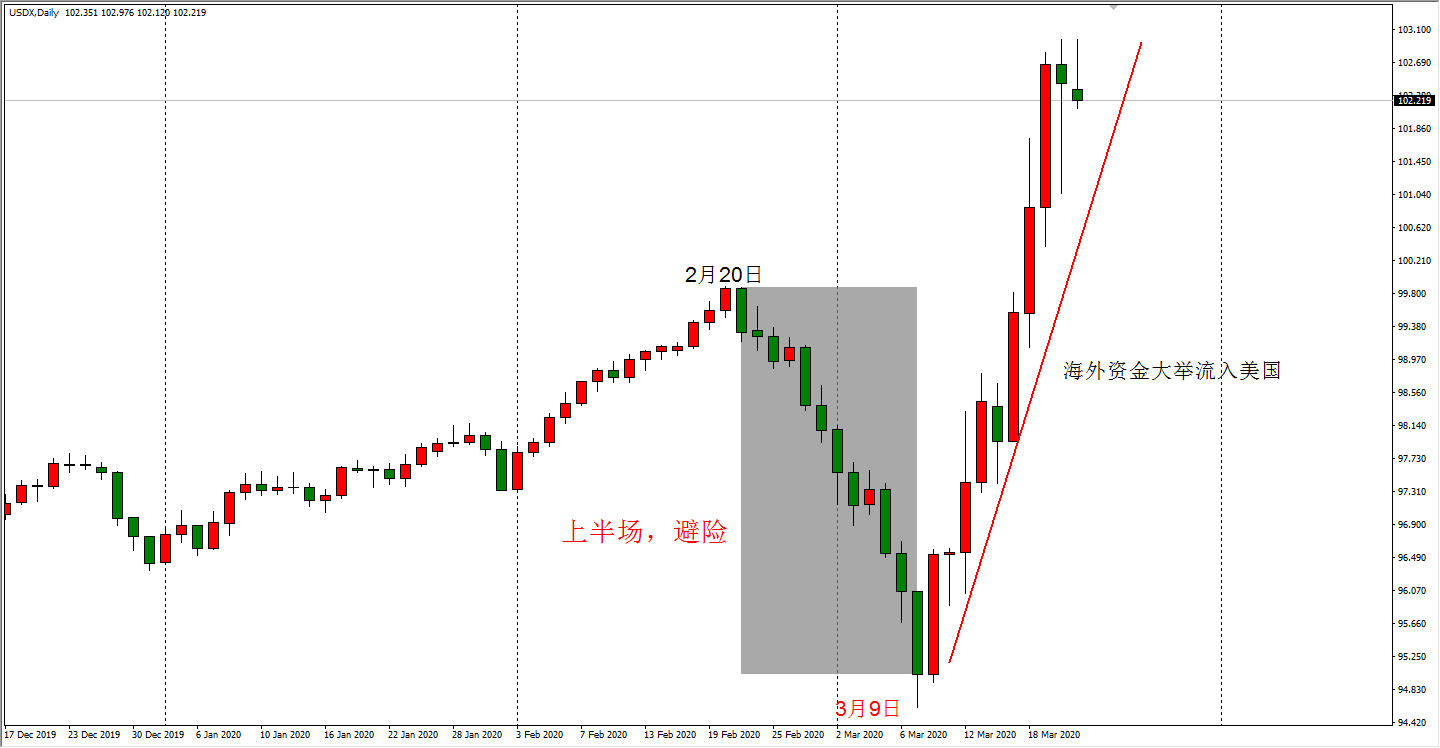 美元指数自3月9日出现最低点,至今不过两周时间,却已经从94的低位一路上涨至103的高位,足见疫情冲击之下,海外资金对美元的青睐。同时期,美国十年期债券收益率自低点0.5%上涨至最高1.18%,而债券收益率的升高,意味着市场避险情绪的下降,美债纷纷被抛售。海量资金涌入美国,既然不是为了购买低风险债券,那么大概率是想要抄底美国股票市场。当前标普500指数累计下跌31.61%至2304点,道琼斯指数累计下跌34.51%至19173点,纳斯达克指数下跌29.32%至6879点,单从技术角度考虑,美股确实已经具备底部特征。但是,决定未来美股能不能反攻的决定因素并不在技术面,而在于当前新冠肺炎疫情所导致的恐慌情绪何时能够消退。当前美国累计确诊病例为3.5万,每日新增确诊6670人,数据来看,没有表现出任何拐点迹象。应对政策层面,美国政府在3月13日提出全国进入紧急状态,但民众自觉程度远低于中国“封城”时期的民众自觉程度,所以疫情得到有效控制的时间也将长于中国模式下的20天时间(自封城开始至新增确诊下降的中国模式时间)。综上所述,虽然海外资金大举流入美国,但美国疫情拐点远未到来,不建议依靠“超跌反弹”的技术思路进行抄底。