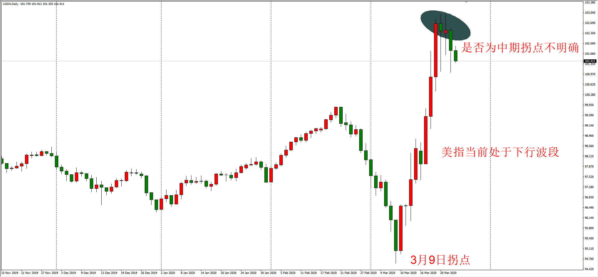 美元指数的走势有两方面指示作用:其一,代表海外资金是在流出美国还是流入美国;其二,决定黄金未来的上涨与下跌。3月20日开始,美元指数出现由涨转跌的分界,当然现在还不清楚该分界在短期有效还是长期有效,唯一可以确定的是当前美指处于下跌波段当中。根据08年金融危机时期美元指数的表现情况,美指一旦出现升值拐头迹象,黄金就将开启涨势,同时股票市场探底回升。所以,将3月20日高点当做中期阻力位,有其合理依据。只是从现实角度考虑,美国累计确诊人数高达5.5万,每日新增确诊八千七百多人,疫情形势依旧严峻,经济还将进一步衰退。如此看来,3月20日高点或许只是一个短期阻力,将很快被重新突破。由于历史往往不会简单重演,所以笔者更相信后一种结论,也就是103.01只是因为美联储超级量化宽松刺激政策形成,并不是市场探寻到的美指在疫情期间的最高点。