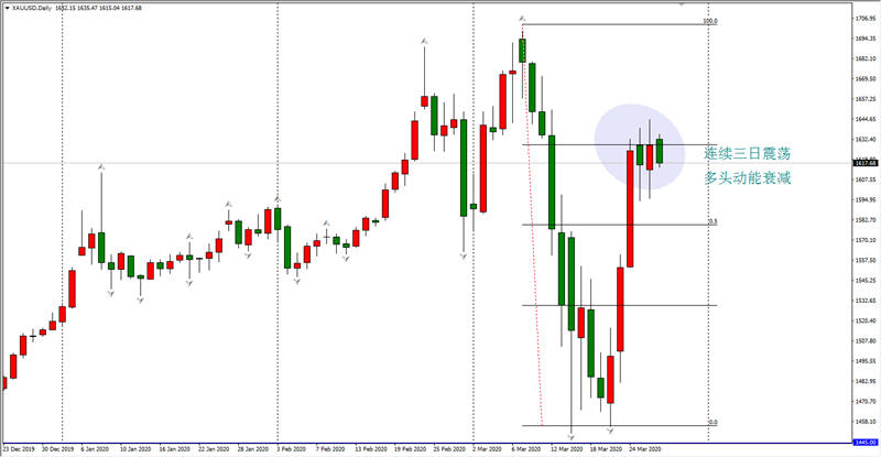 黄金前期连续三个交易日长阳线上涨,最高触及1644美元之后涨势暂停,截至目前依旧维持短线震荡格局。G20峰会释放5万亿美元利好消息,但黄金表现平淡,并未出现大涨或者大跌。目前金价已经反弹至前期下跌波段的70%位置,处于临界状态,如果进一步上行,则有可能形成多空反转,但如果在此处形成顶分形阻力,则反转失败,空头趋势将延续。