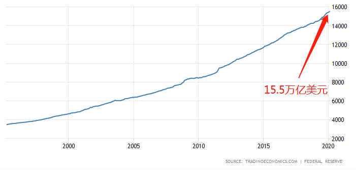 在货币乘数效应的影响之下,M2数据更能代表流通在市场里的货币总量。从上图可以看出,当前美国最新M2数据为15.5万亿,相比5.25万亿的基础货币。总量扩张了2.95倍。并且,即便是在2018年后美联储加息缩表,M2总量也没有出现拐点。