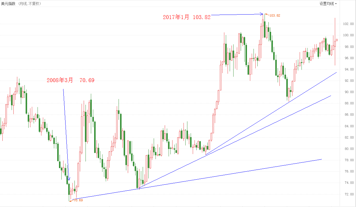 伴随着美联储资产负债表的大幅扩张,美元指数也走出了持续性的牛市行情。自2008年3月开始,直至2017年1月份,美元指数从70.69上涨至103.82,涨幅高达46.86% 。