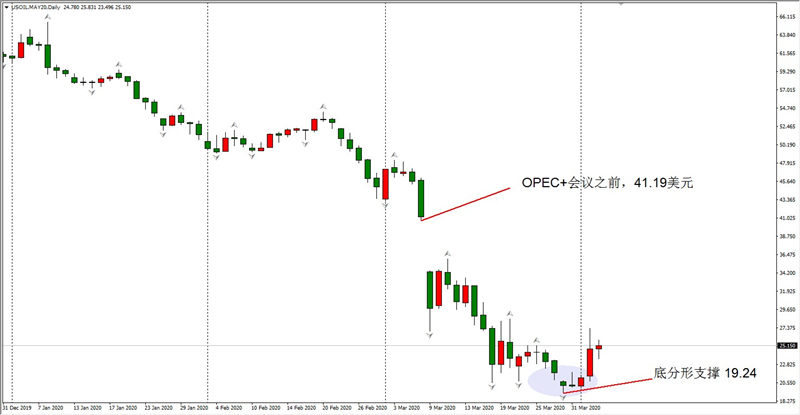 原油日线级别已经寻到短期支撑,本周一的低点19.24位置已经形成底分形机构,从本后面三个交易日来看,该支撑较为可靠。从技术角度预计,下周美原油收出阳K线可能性较大。在OPEC+会议谈判破裂之前,美元原油收盘价在41.19美元。如果未来沙特和俄罗斯在美国的斡旋下采取联合减产措施,预计未来油价上行的最高点也在41.19美元附近。除了供应端之外,需求端受到疫情冲击而大幅下降。但新冠疫情具有较强季节性,随着气温的升高和全球各国防控措施升级,预计疫情将很快得到控制。届时,在原油需求恢复的加持之下,即便减产协议没有达成,预计油价回升至30美元/桶上方也并非难事。