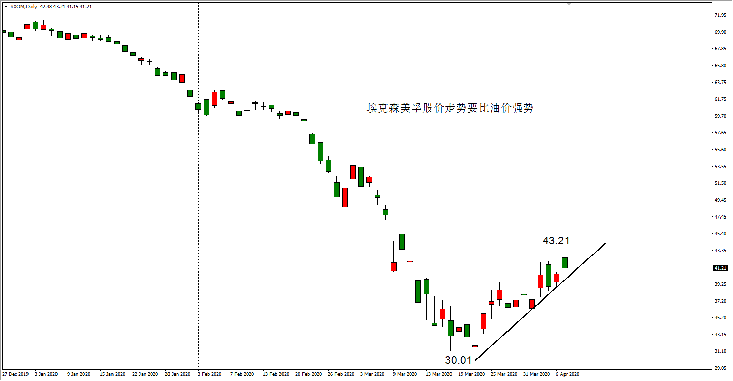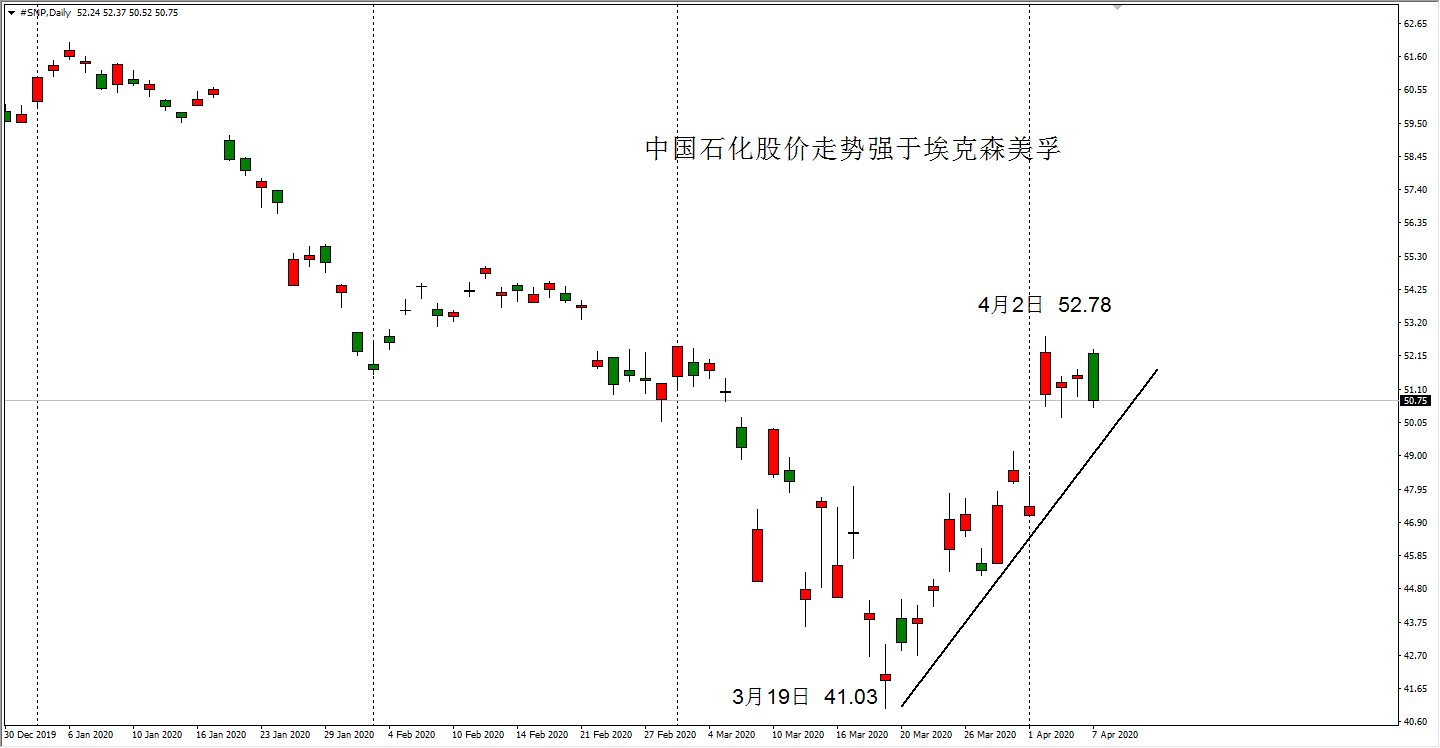 中国石化是中国境内最大的石油化工企业,其股价走势与油价同样存在密切联系。从上图可以看出,中石化股价在3月19日就已经探得底部支撑(41.03美元),经历将近两周的上涨之后,冲高至52.78美元,涨幅18.07% 。