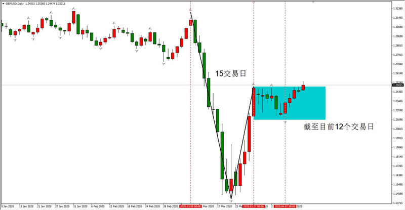 但是,从上图可以看出,磅美汇率在3月20日触底,4月7日的次低点确认20日的中期低点,技术角度来说,磅美汇率未来看多。又因为前期大跌消耗K线总数为15根,当前多头突破勾形已经消耗12根K线,预计本周的五个交易日磅美汇率将迎来较大涨幅,这与美元指数将迎来较大下跌相呼应。