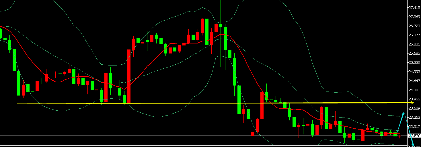 昨日整体符合预期判断,维持周初底部开始折腾整理,短期会偏弱下滑为主来对待,预计指向20及下方 还是存在机会的,此位置下也是建议低多为主;那么今日该如何解读:第一,日线级别上周出现一波快速反抽,不过压制中轨再度回落,昨日开始压制短期均线走跌延续,短期现在是偏弱整理为主,而价格一旦试探20-19底部也容易出现背驰形成双底支撑超跌反弹;第二,小时线要明确几个关键压力的下移,昨日早盘24.6一线双顶压制,美盘反弹受压24再次下滑,那么今日的防守应该是24,这里不突破之前,价格不会出现太大的反抽动作,以此作为防守,反弹压制继续短空;另外,下方22-21.7存在一定支撑,不反抽的情况下,先慢跌触及企稳后可以考虑短多试探,因为小时线macd也存在一定的底背驰反抽动作;操作上,建议24作为防守,23.5及上方去空或者22-21.7短多试探,继续底部的整理过程;