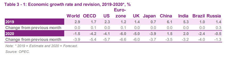 除了油企的ROE数据,还有全球经济增速数据可以作为油价未来走势的重要参考,后者主要涉及到需求面的变动。从上图可以看出,全球经济增速从2019所预期的2.9%下修至-1.5%,变动幅度3.9%;欧元区经济增速预计为-6%,可以说大幅下滑;美国经济增速下修至4.1%;中国经济增速下修至1.5%,正值。可以说,在全球经济增速正增长之前,油价都不会有大幅反弹。OPEC+的减产和油企的破产,最多让油价上涨至30美元/桶之上,而无法将其价格推升到起跌点70美元的高位。