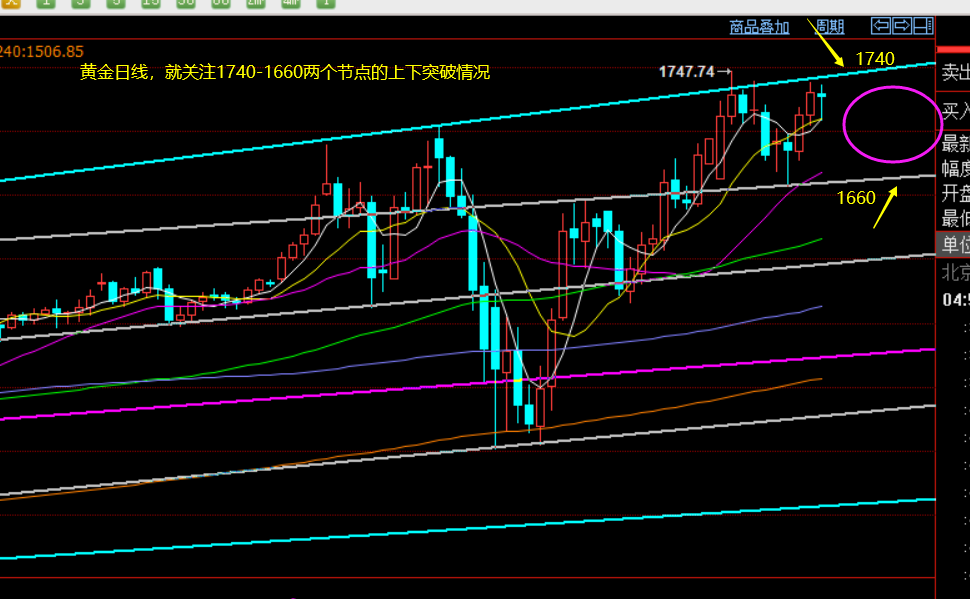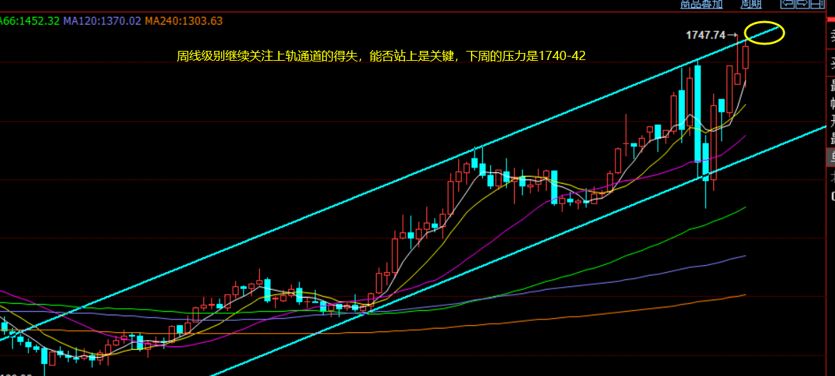黄金周线分析:中期方向看周线图,还是围绕如图的上行通道发展,上周刺破上轨压力1730后冲高回落,本周并未延续调整,而是依托1660探底拉升,再次回归通道上轨测试,下周则关注1740-42上轨压力,看周线的收线情况来决定5月份的整体强弱,目前走法,还是偏强运行当中;