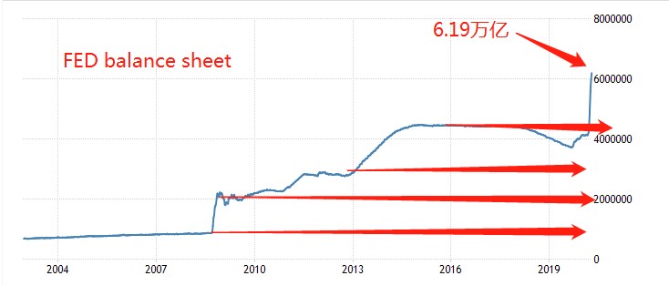 在2008年次贷危机之前,美联储资产负债表规模仅有1万亿美元,十二年后的现在,美联储资产负债表规模已经膨胀至6.19万亿美。这期间,2010年到达2万亿美元,2013年到达3万亿,2016年至最高(2020年之前)4.47亿美元,基本是每3年增加1万亿的规律。2018年后,美联储采取了加息缩表的政策,但没有持续多久,便被特朗普强制按下暂停键。现如今,在鲍威尔大开大合的宽松政策下,资产负债表总额又创出历史新高。