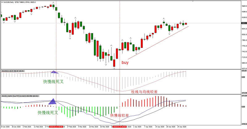 美股早在3月23日就已经出现大幅反弹,虽然市场人士分析其不具备基本面支撑,但是高达25%的涨幅似乎也说明了投资者对未来经济复苏的乐观心理。技术角度来看,MACD提示当前处于多头趋势当中,最早入场时机在3月26日;4月23日底分形支撑确认,再次形成入场信号,并且该信号具备回撤结构支持。考虑到五月上旬多国将尝试复工,五一小长假期间纳斯达克指数或将再次出现亮眼表现。