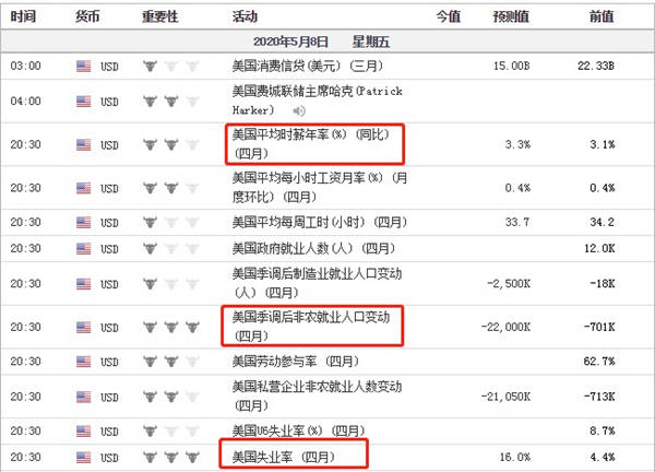 每个月第一周的周五都会迎来美国非农就业报告的公布,4月份的非农就业报告将在明日(8日)晚间8:30公布。在报告中,有三个数据需要交易者重视,一是非农就业总人数,3月份减少70.1万人,4月份数据预期减少2200万人,增幅较大,预期利空美元美股,考虑到周三ADP数据已经显示4月份美国劳动力市场出现问题(减少2023.6万人),市场有心理准备,所以明日数据冲击力或有所衰减;二是4月份失业率年率,前值4.4%,预期值16%,同样大幅上升,因为5%的失业率就代表劳动力市场充分就业,所以失业率数据将对美元美股形成重大利空冲击;三是4月份小时工资增速年率,该数据之所重要,是因为我们不单单要观察就业人数的增量,还要观察存量,也就是已经就职的劳动人群,他们的工资水平相比去年是在不断增加的还是减少,或者是维持不变的。最基本的要求,小时工资增速年率要高于本国通货膨胀率,也就是所谓的收入跑赢通胀。平均时薪年率前值3.1%,预期值3.3%,当前美国CPI 1.5%,处于健康水平。