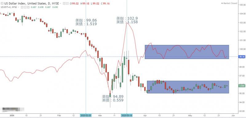 虽然美债与美指的月线统计数据相关性较低,仅有0.4160,但从日线走势图的比较来看,两者在热点事件爆发后,表现出极强的相关性。在新冠肺炎疫情海外蔓延的2月份,美债收益率早于美元指数触顶下跌,随后两者在同一天触及阶段性低点,美指跌至94.89,美债到期收益率跌至0.559%;在疫情出现一定程度好转之后,两者又纷纷上涨,至3月19日,美元指数涨至102.9,美债到期收益率涨至1.158% 。从四月份开始,美债收益率走势开始窄区间震荡,同期美元指数也表现出区间波动形态。