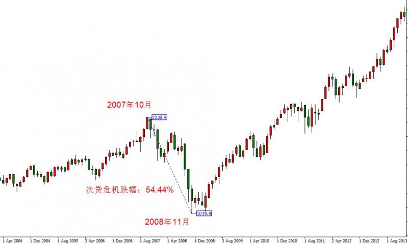 08年次贷危机期间,由于互联网类科技股没有处在漩涡中心,所以纳斯达克指数并未重演2000年互联网泡沫的空头行情。自2007年10月至2008年11也,总计13个月的时间,纳斯达克指数从2238.9跌至1019.9,跌幅54.44% 。幅度相比互联网泡沫时期下降很多,但如次贷危机一般的事件出现频率依旧较低,不能满足长期投资者的入场频率要求。50%左右的跌幅,是历次经济危机对股票市场造成冲击的平均幅度。包括中国沪深300指数在15年杠杆行情崩溃后,出现40%左右最大跌幅的情况。