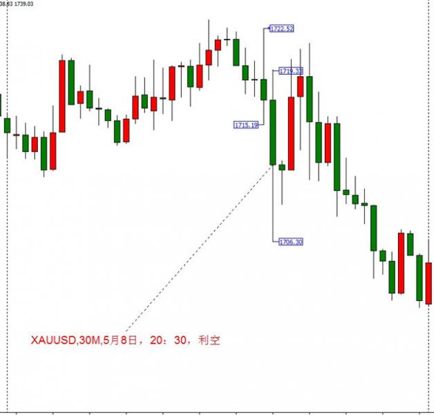 之所以选择30分钟周期,是因为非农就业报告对市场的冲击会在30分红内消失,选择过长或者过短的周期观察,都不能得到客观的结论。5月8日晚间,北京时间20:30分非农就业报告公布,前值减少70万人,预期值减少2200万人,公布值减少2050万人,虽然公布值低于预期值,但由于失业人数绝对值过大,导致该数据依旧是利空美元指数。从上图可以看出,数据公布之后,黄金20:30~21:00的K线收出长下影线的长阴线,本该利空美元力度黄金的数据,却反而提振了美元指数而压制了黄金多头。