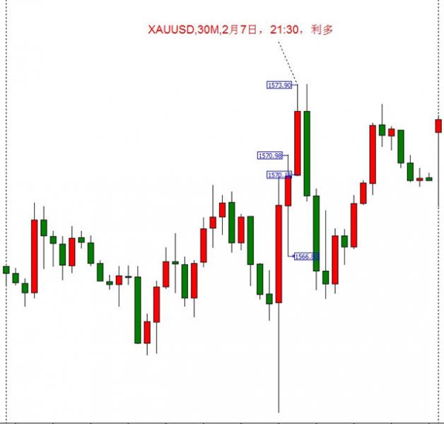 如果5月8日的数据是受到新冠肺炎疫情的影响而不具代表性,那么可以来看2月7日非农数据公布后黄金的走势,此时疫情仍在中国区发展,没有蔓延至海外。冬令时21:30非农就业报告数据公布,前值增加14.7万人,预期值增加16.5万人,公布值增加22.5万人,远远高于前值和预期值,但从数据来看,大幅利多美元和美股,利空黄金和非美货币。然而实际上,黄金在数据公布后的21:30~22:00之间,收出一根长阳线,自低点1570一路上涨至1573.9,短线涨幅降薪40标准点。非农就业报告再一次扮演了美元和黄金的反向指标。