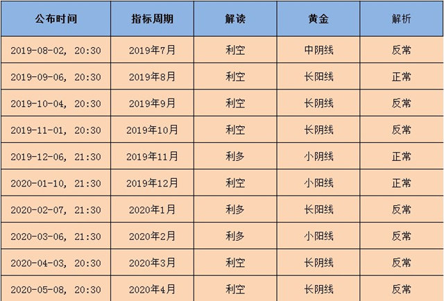 下图是对自2019年8月至2020年5月期间,十次非农就业报告数据公布和黄金30分钟级别走势关联性的统计汇总。可以看出,8月份数据利空美元,黄金却下跌(反常);