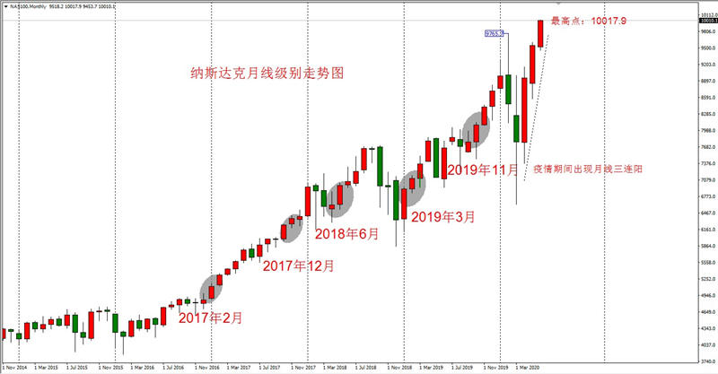 三连阳走势极为重要,它代表长线资金入驻该品种,预示着未来行情由较大概率出现持续性多头。2017年2月和12月,两次大级别多头走势的开始阶段,均出现三连阳结构;2018年6月同样如此;2019年3月和11月的多头波段同样出现三连阳结构。进入2020年,4月5月和6月三个月份均收出阳线,并且突破2月份疫情最严重时刻所形成的高点9755.9 。其实对纳斯达克指数做各种技术分析都是徒劳,因为它确确实实已经连续上涨将近二十年,不断挑战新高也是预期之内的事情。