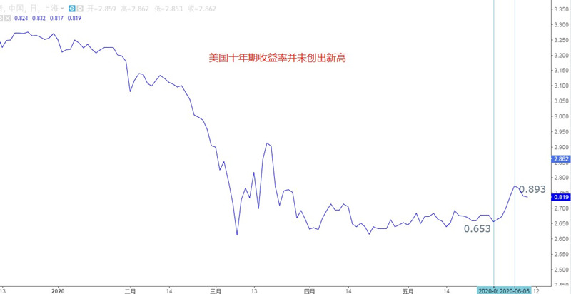 美股与美债共同上涨,代表宏观面经济复苏较为健康。但是,十年期美债6月5日达到近期高点0.893%,本周一直处于下行状态,并未创出新高。所以,对本次纳斯达克指数突破10000点后能否持续上涨,笔者持怀疑态度。