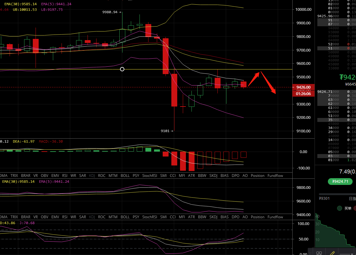 1:9550附近空单买入,止损9650,目标9400-9300