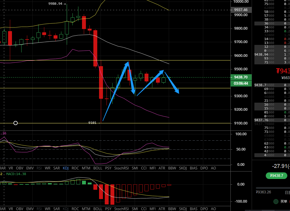 小时线来看价格运行在布林带中轨,布林带呈收口状态,RSI位于50轴运行,KDJ位于50轴上方拐头向下,MACD多头能量均衡放量,快慢线在零轴附近粘合,晚间预计还将震荡为主,上方压力位9550-9650.操作逢高做空