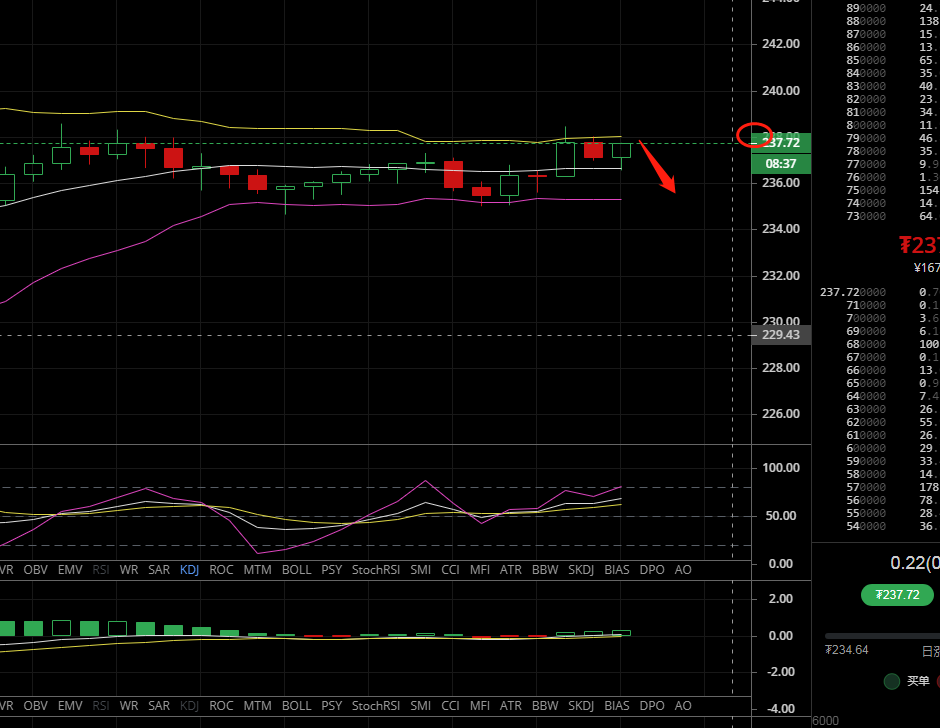 以太坊目前还是联动比特币,小时线来看,晚间上涨至布林带上轨压力位238回落,目前价格运行在布林带中轨上方,MACD多头能量均衡放量,快慢线在零轴附近粘合,KDJ位于50轴上方拐头向上散发。
