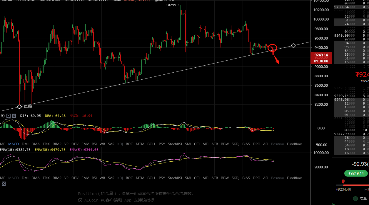 行情自昨日凌晨向上方拉升,受制于9500压制开始回落,随后回落150点左右,直至昨日白盘一直处于在9400上下震荡,最后在今日早间下跌至最低点9234,目前价格9280美金。凌晨给出的策略成功到达点位。