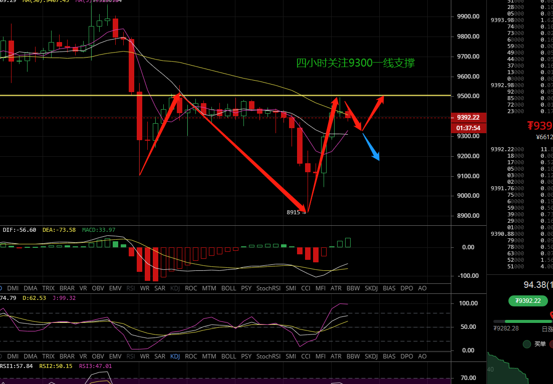 四小时级别看布林带价格从下轨运行到中轨上方。关注下方5日均线和10日均线支撑位9330-9300,这里如果日内没有守住,那么价格还将进一步下行。MACD于金叉运行绿色动能柱逐渐增加。KDJ三线粘合有向下拐头迹象。
