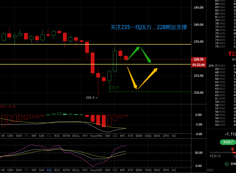 以太坊昨日早间也是随比特币一路强势下跌,从232跌至218附近,四小时来看布林带张口向下,价格运行在中轨下方,MACD有金叉迹象,RSI向下拐头,如果站稳5日均线那么价格可能进一步上行,关注上方30日均线压制234美金。