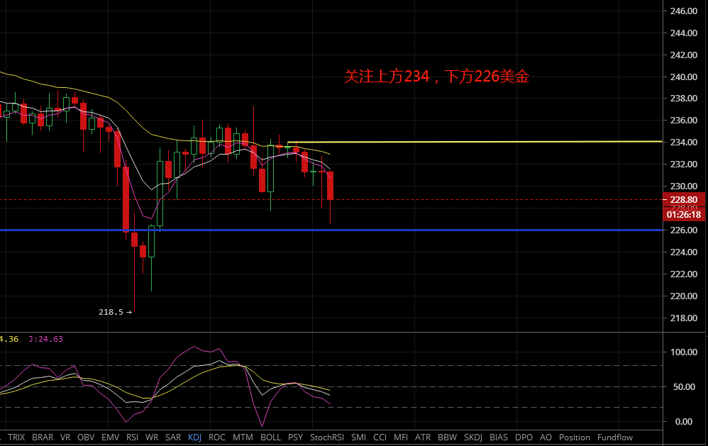 以太坊四小时来看昨日跌破均线后,遭空头连续施压,进而再次下跌,上方压力也随着时间下移,各项指标来看都偏向空头市场,操作上高空为主,上方压力位234,下方支撑226美金。
