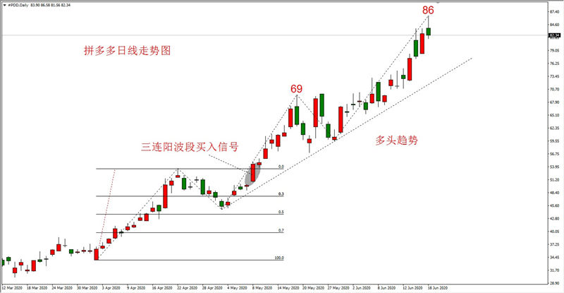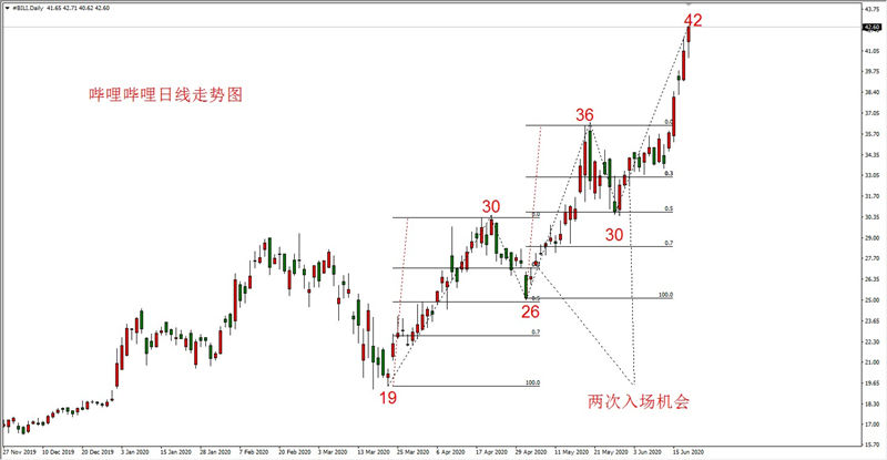 哔哩哔哩价格走势虽然没有拼多多那么流畅,但涨跌起伏极为规律。按照勾形理论当中的A类回撤勾形,有两次入场机会。一次是5月5日的27.5美元/股,一次是6月2日34美元/股。当前市价42.6美元,处于历史最高位,并且不断在创出新高。技术角度看,未来哔哩哔哩股价还将会出现30%~70%的下跌调整走势,但只要不突破70%,就依旧具备看多做多的条件。