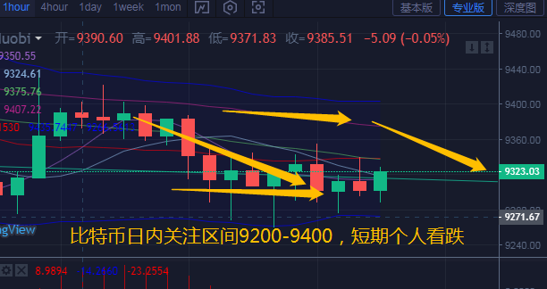 昨日比特币上行动能是逐日递减,但下方日线下轨强势支撑没有被打破,所以行情依旧保持在震荡姿态。今日早间六点价格已经去到9300下方,触及低点9260附近,所幸多次向下试探力度不强,行情保持在有效支撑内,未能进一步下行,目前价格在9310位置。