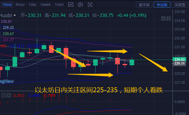 从小时线来看,以太坊跟随比特币的趋势,反弹力度逐步减弱,行情从布林中轨上方逐步下移至中轨下方。多次上探止步于230位置附近,布林带略微缩口,各均线粘合向前运行,附图MACD快慢线运行于零轴下方,表明短期多头动能不够充分。虽然在震荡区间,但是行情走震荡下行趋势,汐柔老师建议操作上以反弹空单为主,凌晨关注225-235区间,破位225可顺势空单进场。