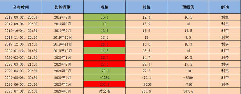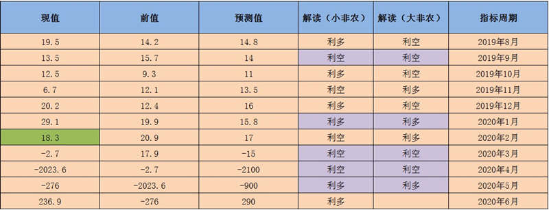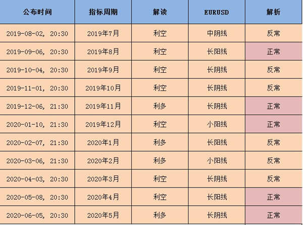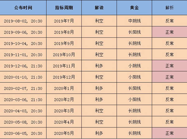图中绿色代表绝对利空美元指数的情况,红色代表绝对利多美元指数的情况。只有2019年11月1日和2020年5月8日出现了介于预期值和前值的现象,需要具体问题具体分析。先来看11月1日,前值增加18万人,预期增加8.5万人,预期与前值相差巨大,代表市场极度看空美国当月劳动力市场状况。然而,最新数据为12.8万,虽然高于预期值的8.5万人,但两者差值仅4.3万人,前值与现值的差距为5.2万人,也就是说,有4.3万人的利多区间,同时有5.2万人的利空区间,综合分析,给出“利空”的结论。再来看5月8日的数据,公布值同样处于前值-70.1万人和预期值-2200万人之间,但由于公布值为-2050万人,距离预期值非常接近,利多区间(150万人)远小于利空区间(1800万人),所以该数据定性为“利空”。只有能够准确判断数据对美元、黄金、非美货币、美股的多空影响,才能够准确把握数据公布后的行情走势方向。