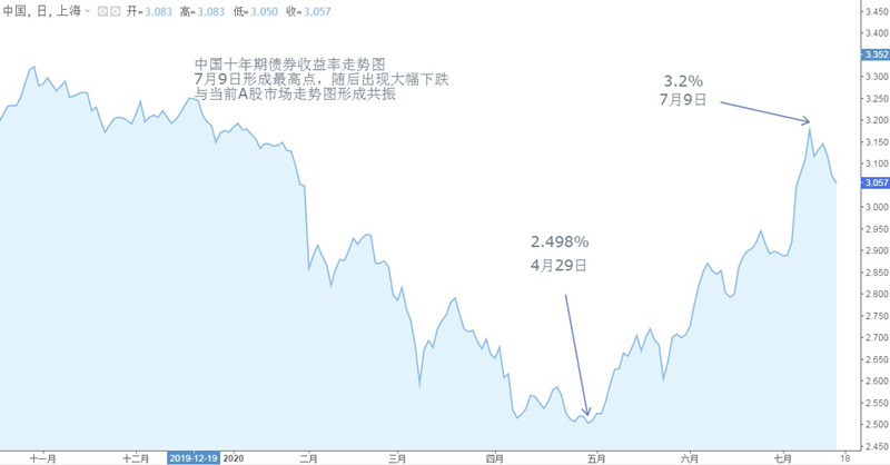 中国十年期债券收益率在7月9日创出中期新高3.2%,之后出现大跌,截至目前报收3.055%,代表市场风险情绪重新升温。上证指数也是在7月9日出现阶段性高点,之后开始弱势下跌,两者出现走势共振。